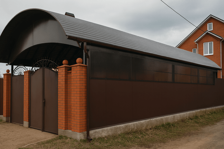 - Толщина и тип металлопрофиля — используются оцинкованные или полимерные покрытия разной прочности.