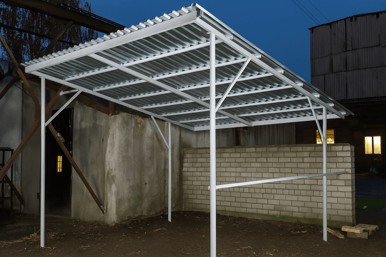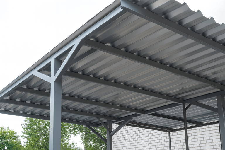 Изготовить навес из профильной трубы можно в короткие сроки — технология позволяет точно рассчитать нагрузки и обеспечить надежность конструкции. Такие навесы подходят для небольших участков и больших парковочных зон.